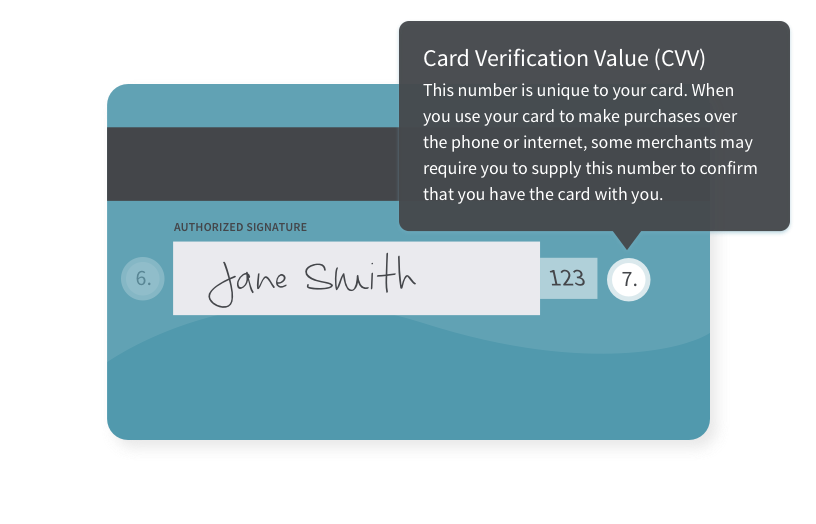Last but not least, the CVV is the 3 digit number next to the signature bar.